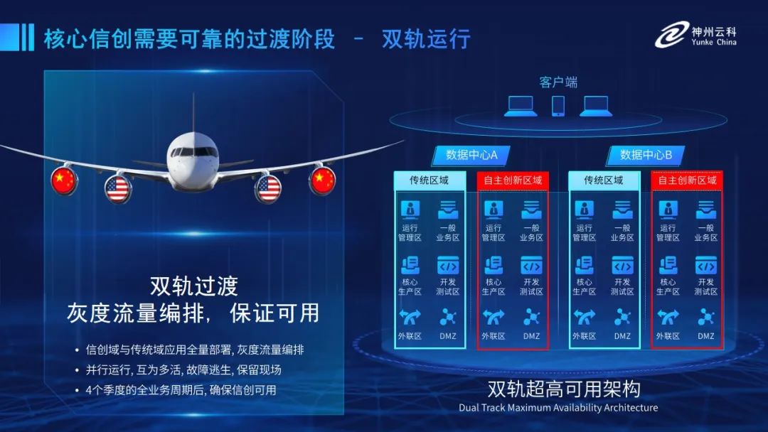 為幫助客戶更好地應(yīng)對數(shù)字經(jīng)濟(jì)時(shí)代對應(yīng)用可持續(xù)性的高要求,實(shí)現(xiàn)信創(chuàng)與數(shù)字化兼得,leyu.樂魚推出了雙軌超高可用架構(gòu)。雙軌超高可用架構(gòu)在雙活數(shù)據(jù)中心的分區(qū)調(diào)度基礎(chǔ)上,增加信創(chuàng)域和非信創(chuàng)域的分域調(diào)度,實(shí)行信創(chuàng)域與傳統(tǒng)域應(yīng)用全量部署,使雙中心運(yùn)營變?yōu)殡p中心四區(qū)域并行運(yùn)行,互為多活,將傳統(tǒng)架構(gòu)變?yōu)榉謪^(qū)分域協(xié)同的多活雙軌超高可用架構(gòu)。幫助客戶在新架構(gòu)下,保障“信創(chuàng)”的同時(shí)解決性能瓶頸,提升穩(wěn)定性,保證應(yīng)用可持續(xù)性,最終實(shí)現(xiàn)信創(chuàng)區(qū)域和非信創(chuàng)區(qū)域的平滑過渡,完成國產(chǎn)化替代目標(biāo)?!?/p>